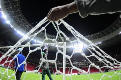 Instalação da rede na trave de gol do Estádio Nacional de Brasília