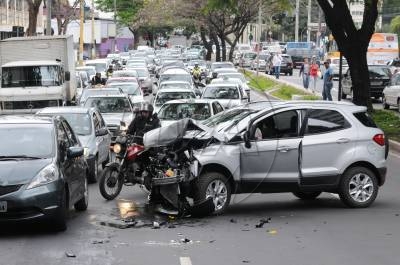 Caminhão baú bate em carro e tomba na avenida do Contorno em BH