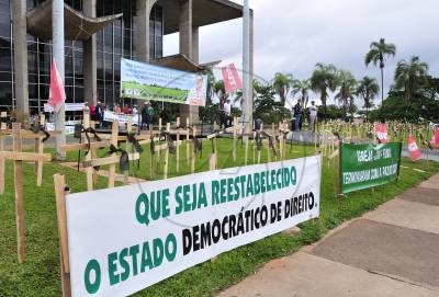 Integrantes da Federação dos Trabalhadores da Agricultura Familiar do Sul - Fetraf-Sul protestam em frente ao Palácio da Justiça